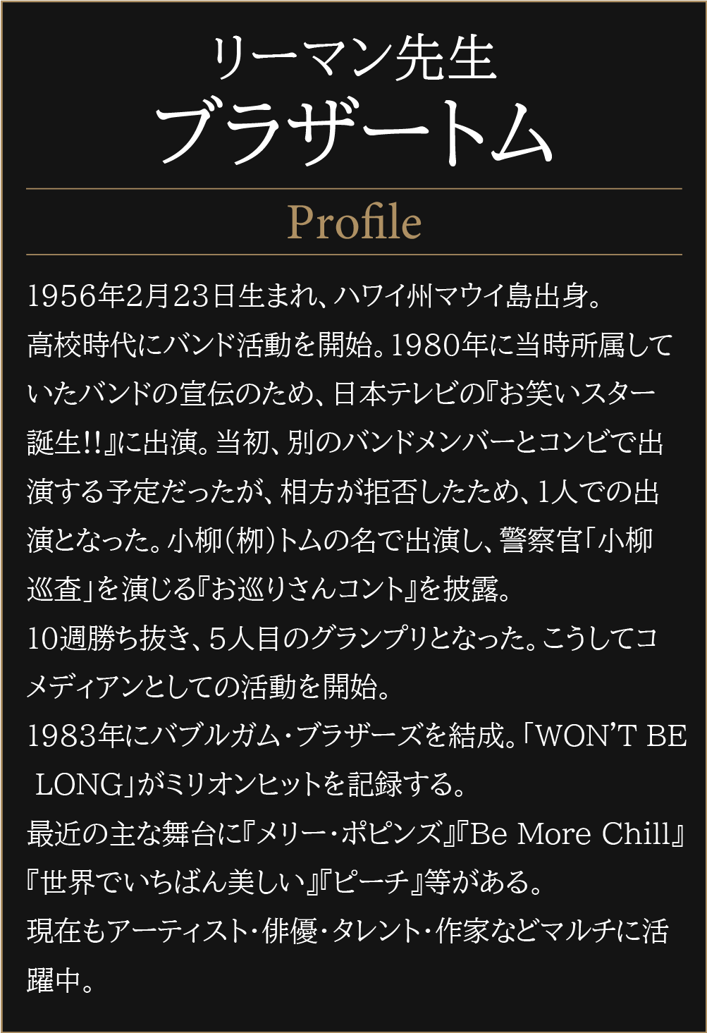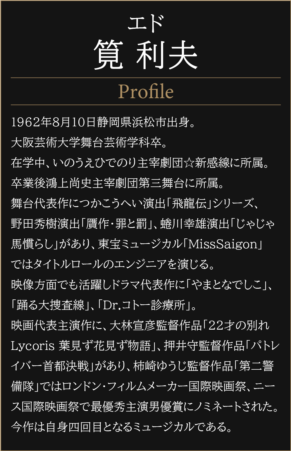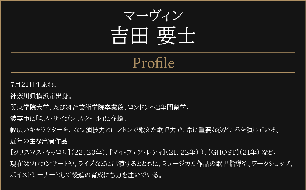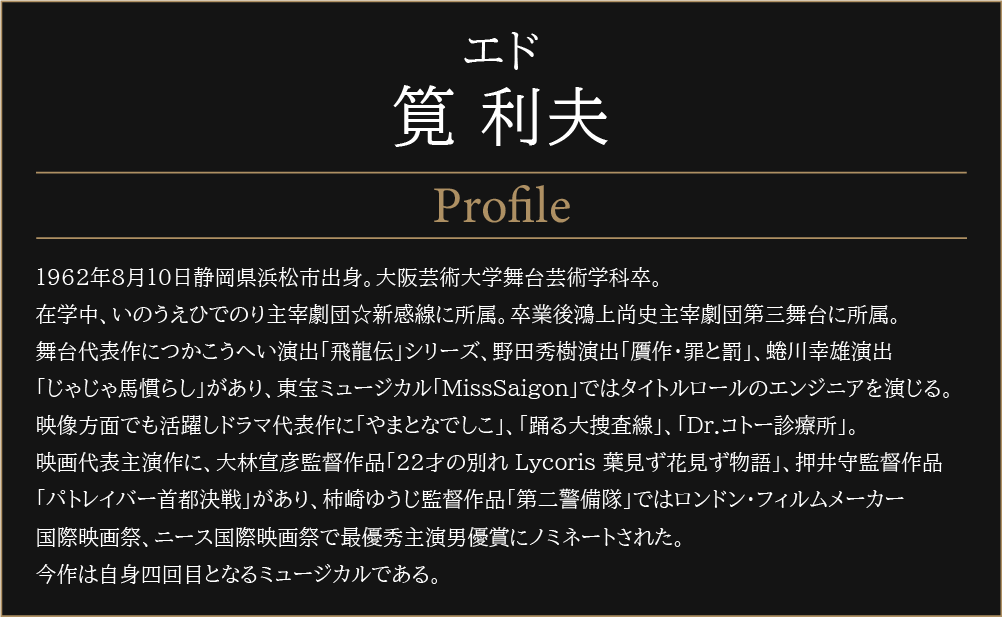 世界中で愛され続ける大ヒットミュージカル『コーラスライン』の作詞家として、トニー賞を受賞したエドワード・クレバン自身の楽曲による自伝的ミュージカル。感動的な成功と挫折の物語と、華やかなミュージカルシーンの数々をお楽しみください。