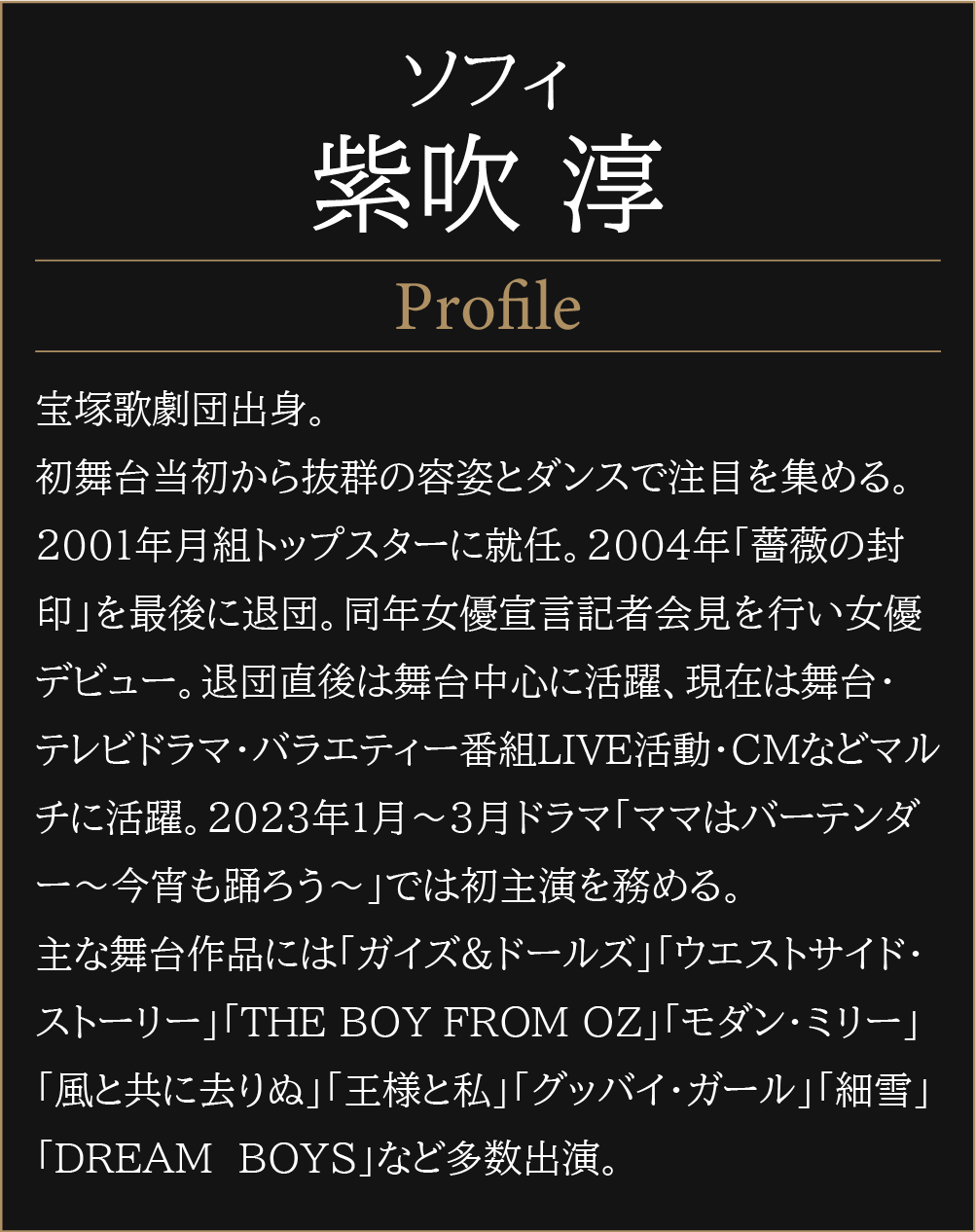 2024年6月30日(日) 愛媛県県民文化会館にて開催いたしましたブロードウェイミュージカル「クラスアクト」は、フェリシア役のキャスト・松岡美桔の体調不良により一幕終了後に中止となりました。